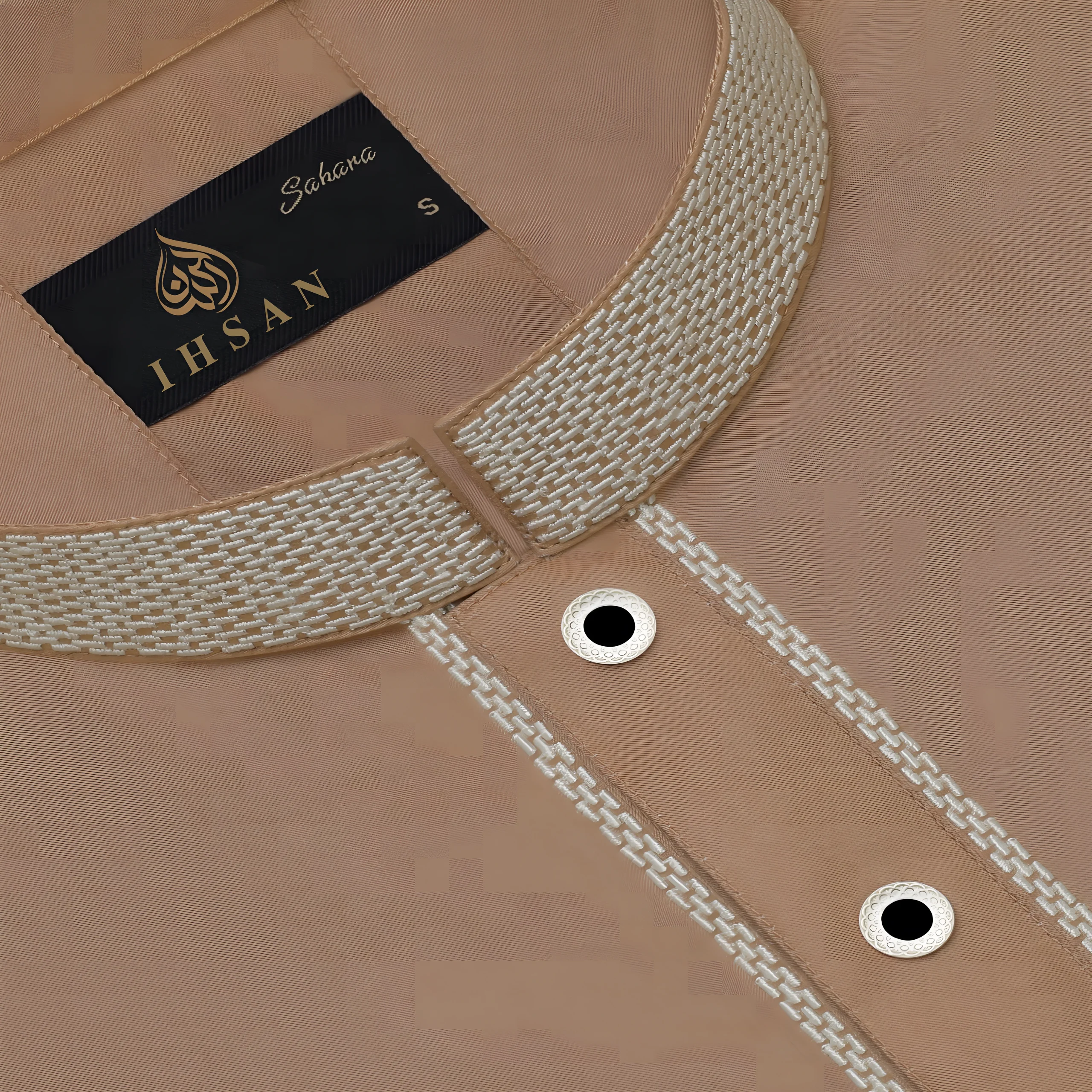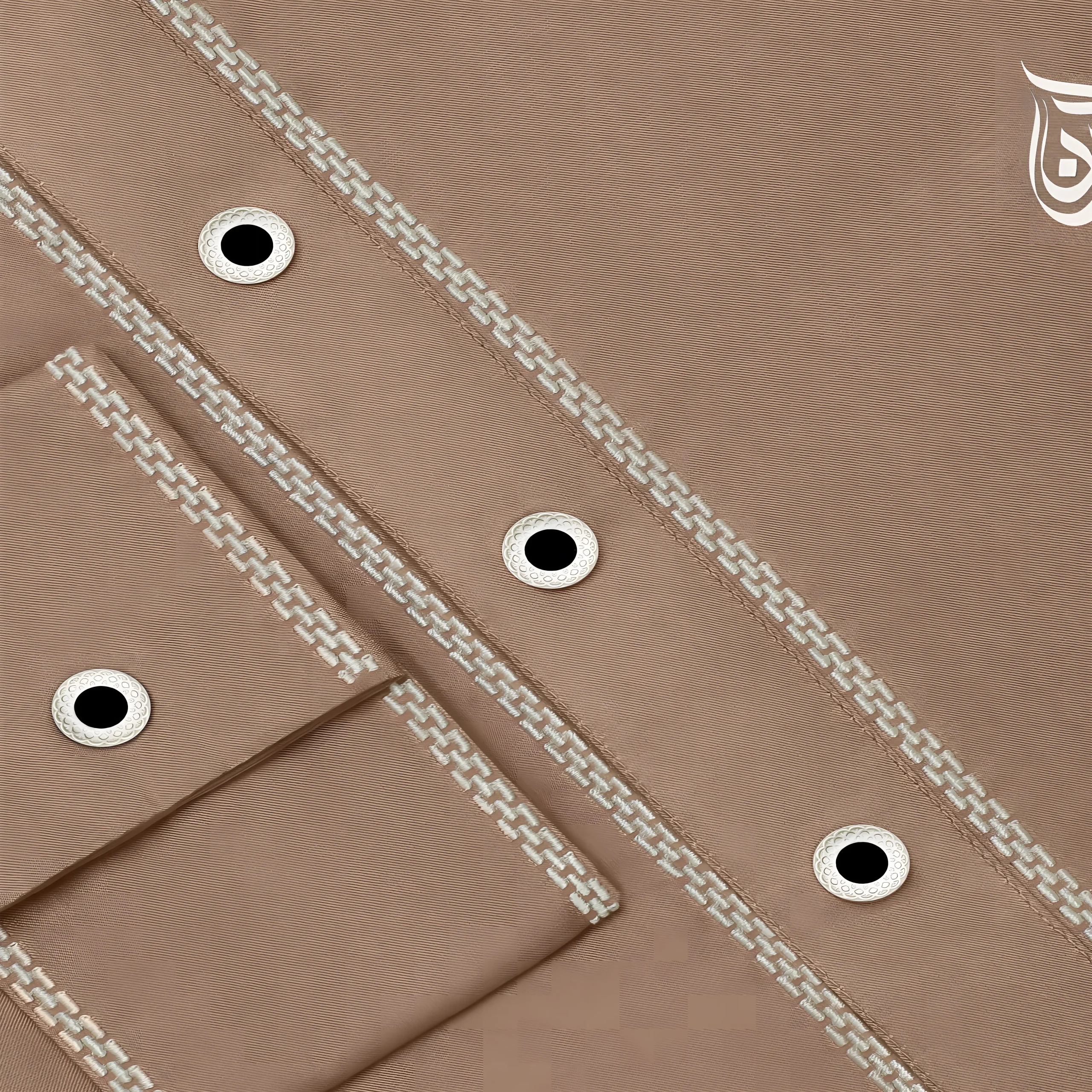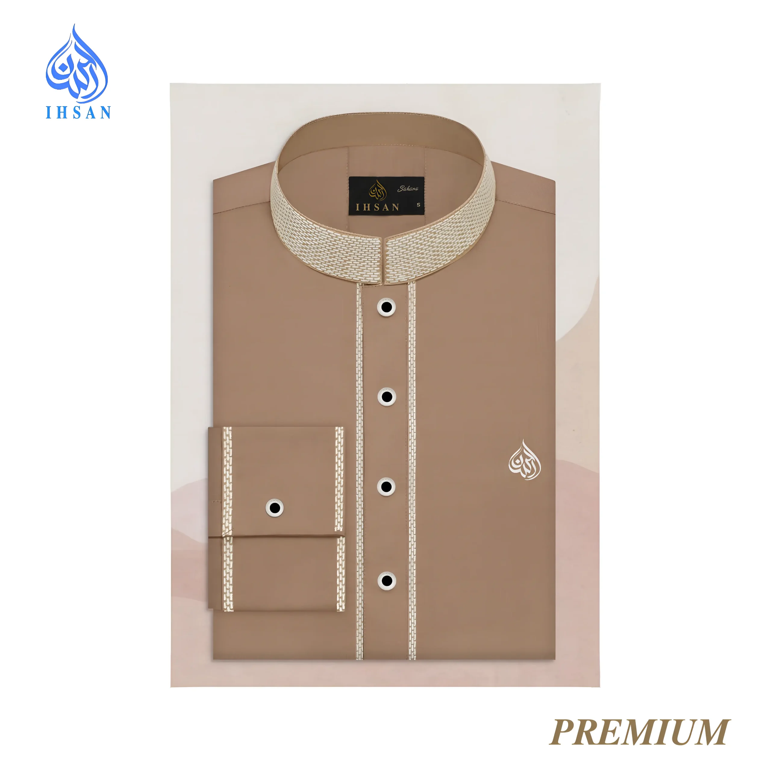 Seamlessly elegant-this pale brown Supima cotton style features emblematic embroidery accents, IHSAN